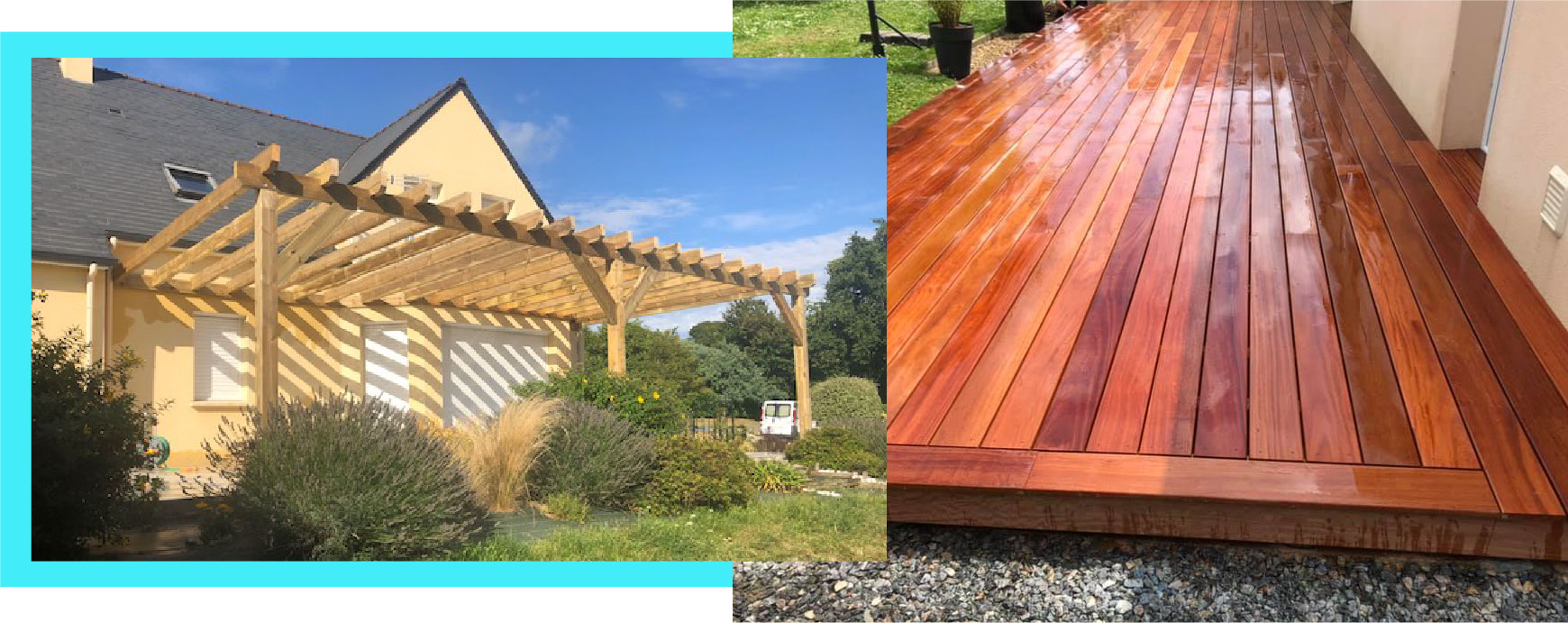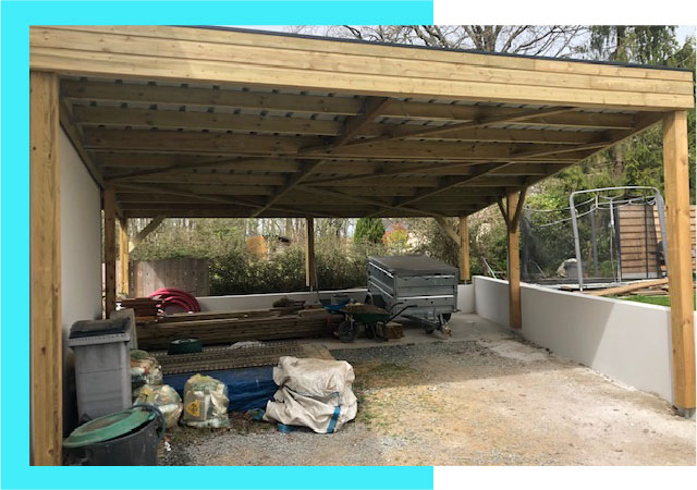 - Large éventail de prestations, incluant l’aménagement de terrasse, la création de pergolas, la fabrication de carports et de garages à ossature bois.